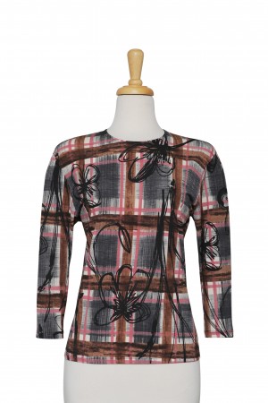 1. Plus Size Pink, Black, and White Plaid Cotton 3/4 Sleeve Top